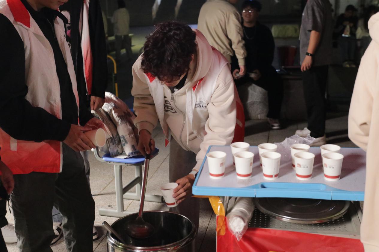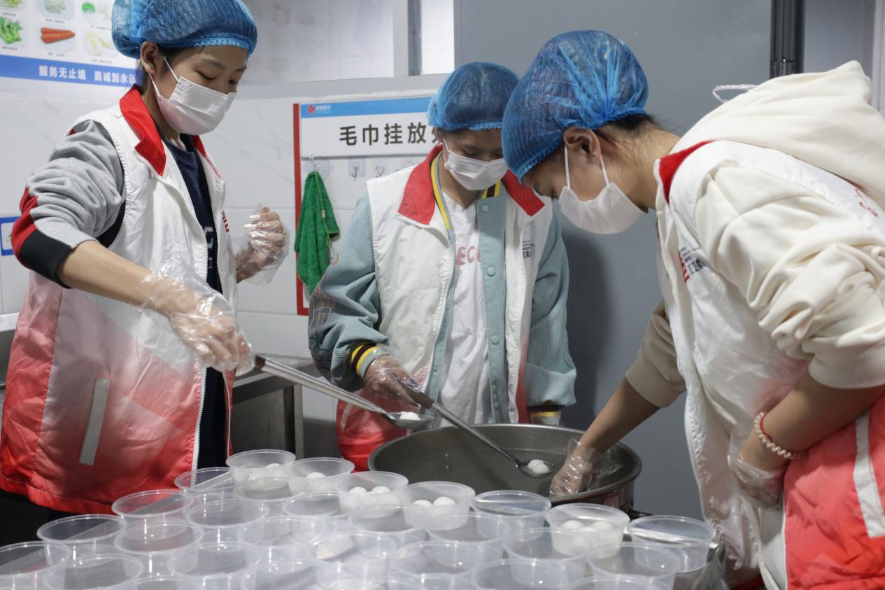 为了让活动暖心落地,活动启幕前,荔园食堂富强餐厅全力协助筹备,后厨早已烟火氤氲、忙碌不停。志愿者们主动搭手协助忙活,默契配合着分装饺子汤圆、熬煮暖心姜茶,分工有序、干劲十足,每一份餐食都饱含用心,只为给大家传递冬日里的贴心暖意。
