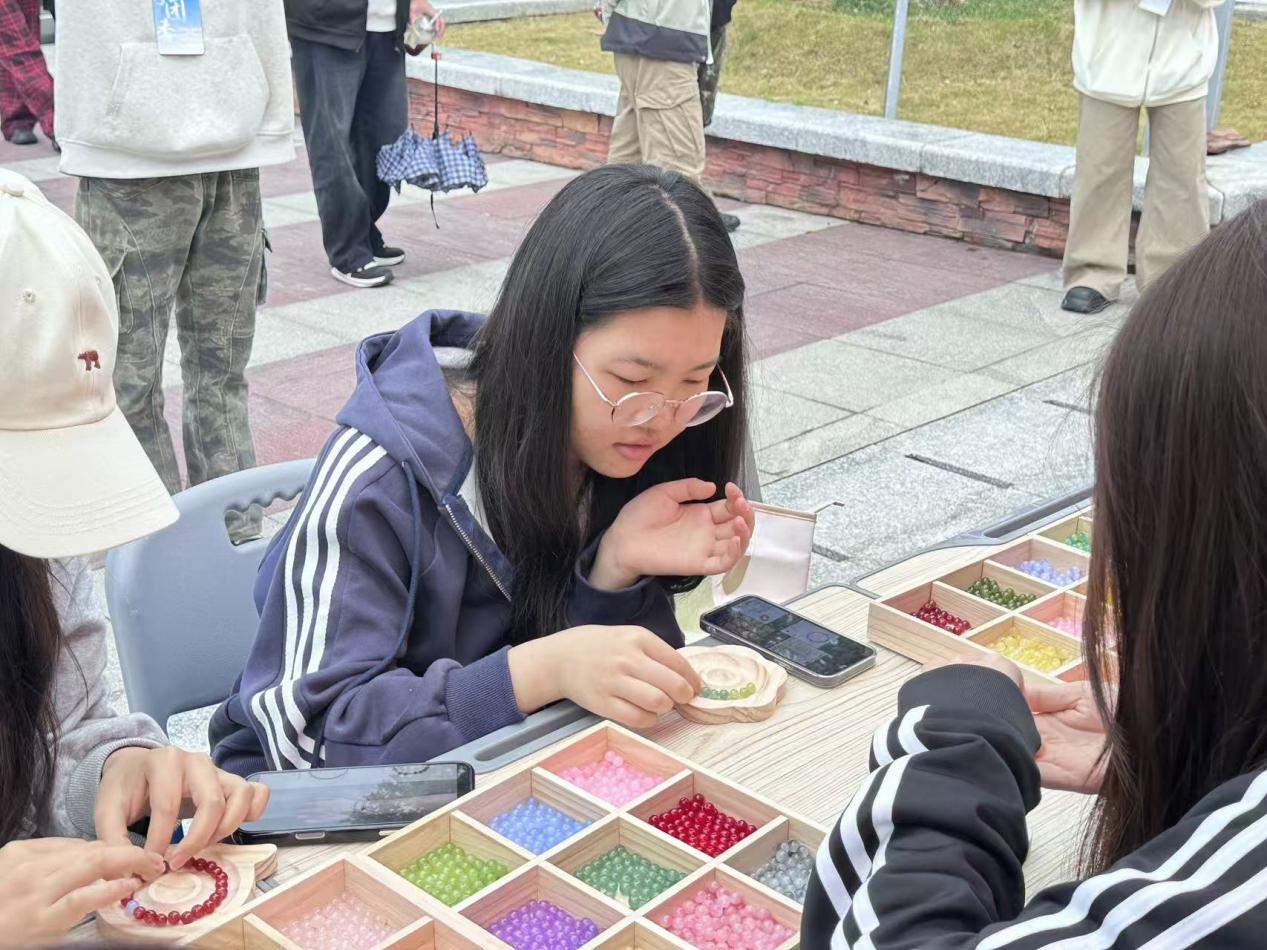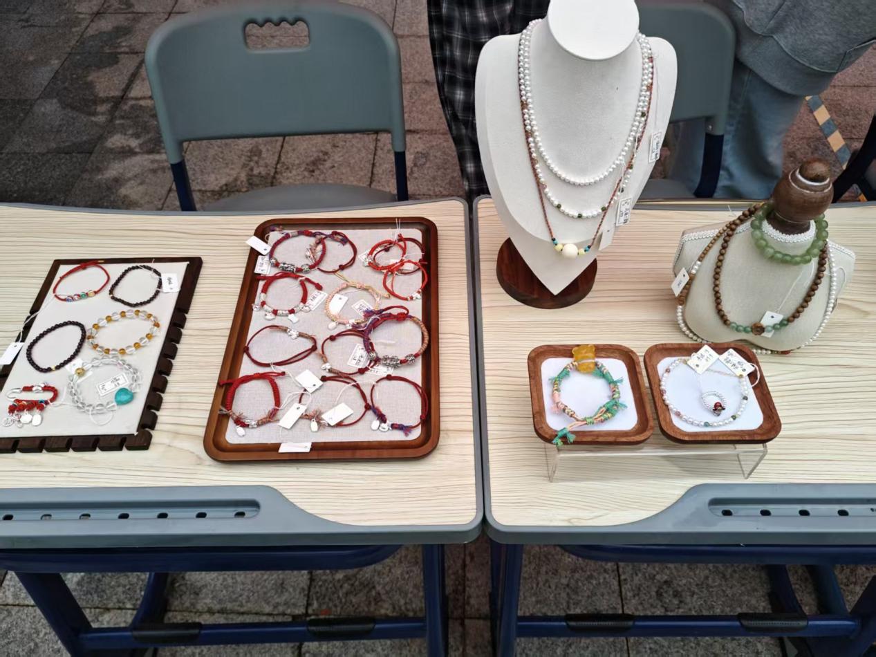最受欢迎的当属手串DIY体验区,免费的散珠、配件等材料一应俱全,社团骨干手把手指导串珠、搭配技巧,零基础也能轻松做出专属手串,成品可免费带走,师生们在动手创作中收获乐趣,传递温情。
