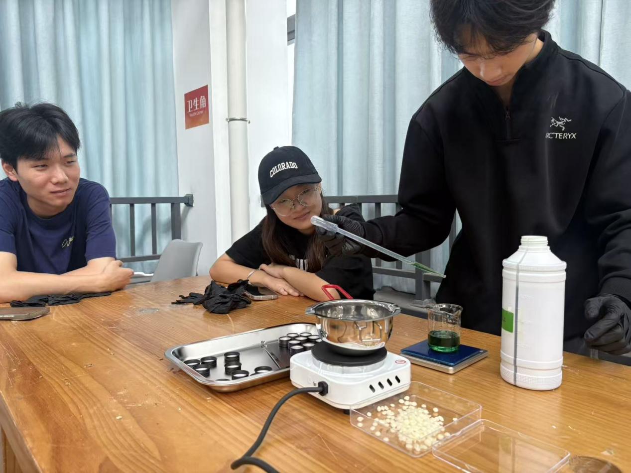 活动特邀合香非遗代表性传承人张朋老师现场授课,围绕古法香膏制作技艺开展“面对面、手把手”实操教学。张老师详解香膏配伍原理、选材要点,并示范调制、塑形等关键步骤,逐一指导学生操作细节。